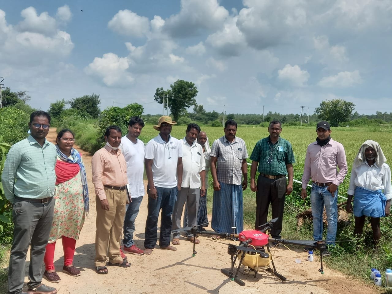 A demonstration of Pesticide spraying using a Drone at Ibrahimpur on 08-10-2021
