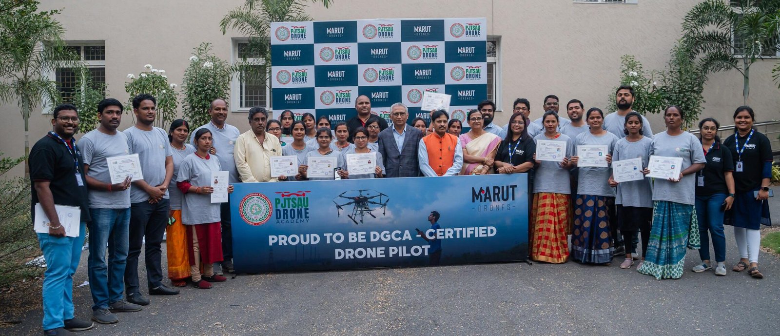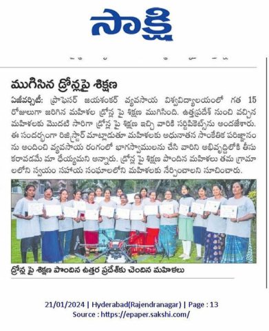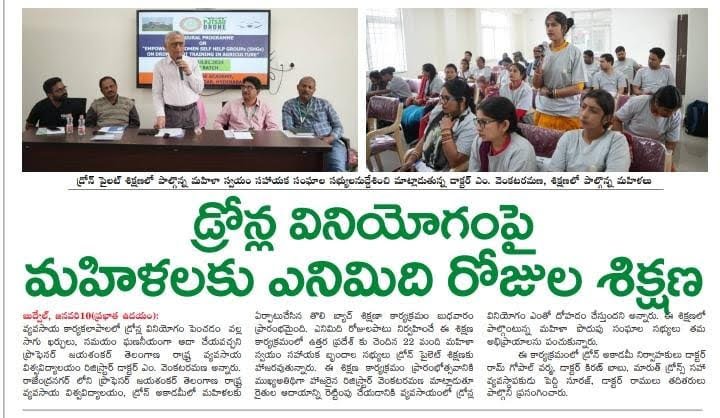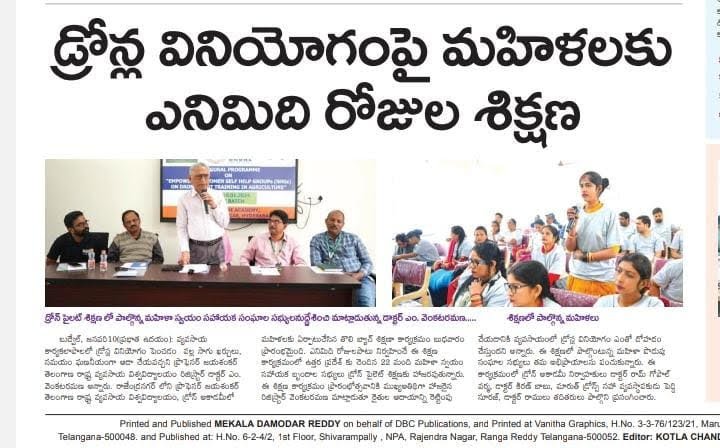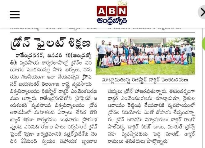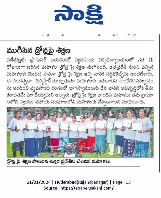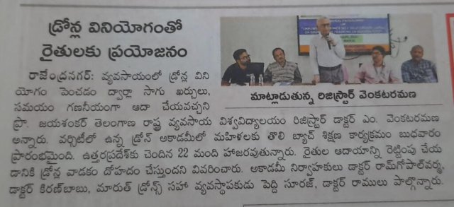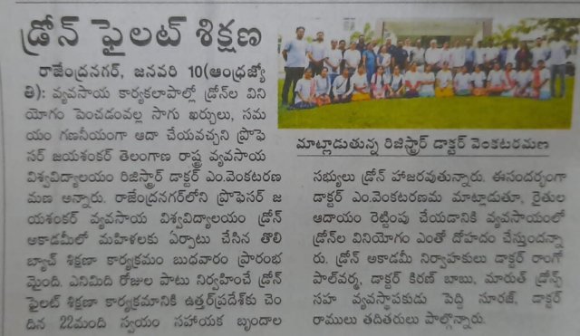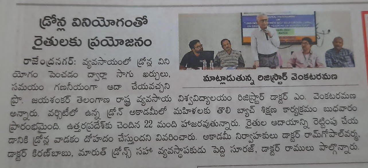 Media Union Agriculture Minister releases Standard Operating Procedure (SOP) for use of Drone in Pesticide Application for Crop Protection and for spraying Soil and Crop Nutrients Second Batch – SHG WOMEN Training from Bihar & Uttar Pradesh First Batch – SHG WOMEN Training from Uttar Pradesh MoU between Professor Jayashankar Agricultural University and Marut Drones for pilot training Union Agriculture Secretary Reviews Drone Use at PJTSAU, Hyderabad, on August 27, 2022. Book Release: “SOPs for Drone-based Pesticide Application in Rice” on 22.12.2022 Drone use permission to Professor Jayashankar Telangana State Agricultural University (PJTSAU) ‘Drone-acharya’: Telangana to lead way in spraying pesticides through drones NABARD chief visits PJTSAU research arms