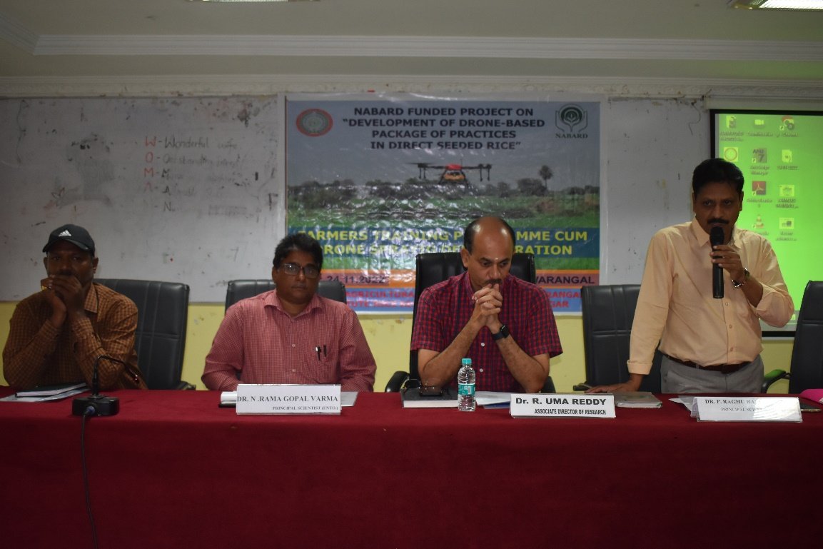 As a part of training and capacity building programmes to farmers and rural youth under NABARD-PJTSAU-Drone-DSR Project, a farmer training cum field demonstration of drone spraying in DSR was organized by Institute of Rice Research, ARI, Rajendranagar at RARS, Warangal in collaboration with DAATTC, Warangal on 24.11.2022. A total of 70 farmers and agricultural diploma students from APT, Warangal, faculty from RARS, Warangal and Agricultural College, Warangal, input dealers and print and electronic media participated in the training programme. The main aim of the training programme cum field demonstration of drone spraying is create the awareness among the farming community on SOPs for drone spraying of herbicides, nutrients and pesticides in DSR as well as scope and opportunities in use of drones in agriculture. Dr. R. Umareddy, ADR, RARS, Warangal, Dr. P. Raghu Rami Reddy, PS (Rice) and Head, IRR, Rajendranagar, Scientists from IRR, Rajendranagar, RARS, Warangal, AG College, Warangal and DAATTC, Warangal were participated.